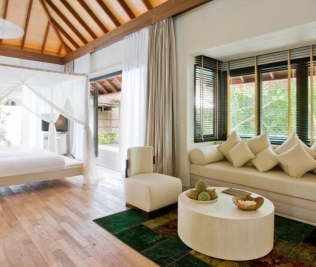 Le strutture fanno riferimento all'architettura indigena pur riflettendo l'ambiente dell'isola. Le suite e ville sull'acqua sono costruite su passerelle di legno che si ergono sopra la laguna poco profonda. Ognuni sistemazione ha la sua terrazza privata per permettere agli ospiti di scivolare dolcemente nel mare, mentre le camere con giardino sono immerse nel cuore tropicale dell'isola. I panorami sono decisamente spettacolari: o giardini rigogliosi, dove i bambini possono giocare, o direttamente nella distesa acquatica.
