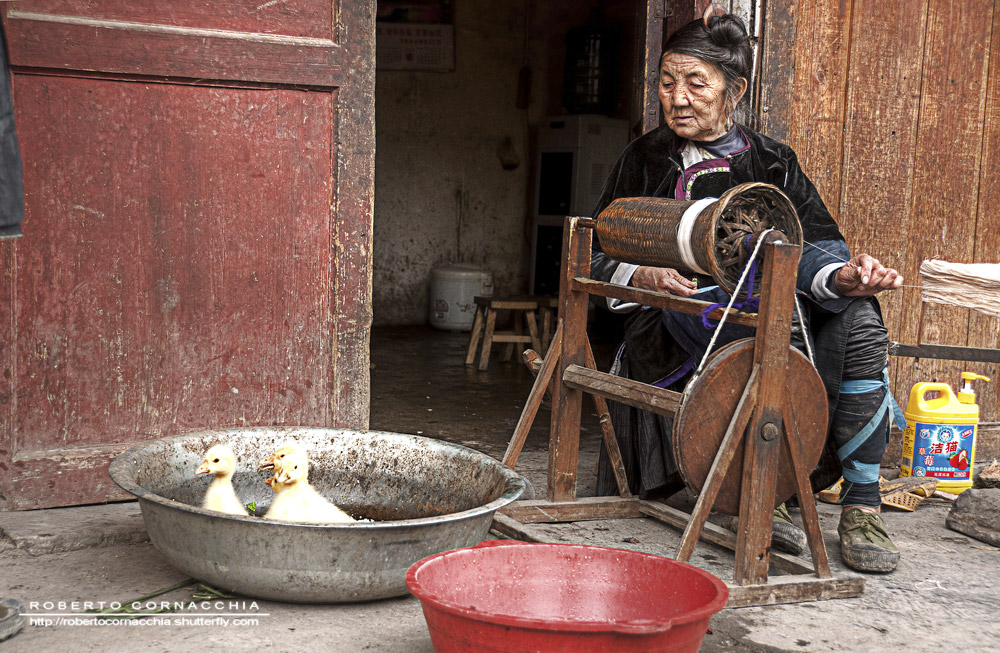 Anziana Dong tiene d'occhio gli anatroccoli mentre fila - Archivio Fotografico Pianeta Gaia
