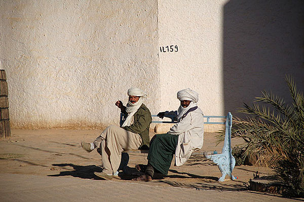 Sveglia alle 6:30 per rimirare l’alba, al termine di una notte molto fredda, però lo spettacolo scalda cuore e mente così si affronta lo smontaggio delle tende con meno ghiaccio nelle mani dopo di una massiccia dose di bollente caffè. Partiamo attraversando l’Erg di Admer e non vorremmo mai lasciarlo anche perché nella parte finale, con la vista sui denti di Tim Rass, lo spettacolo non termina mai. Nel bel mezzo dello scenario, dopo non aver mai incontrato nessuno, ci imbattiamo in una lunga comitiva di Deserctica, una quindicina di mezzi proprio qui dove non pare passar mai persona, ma effettivamente scesi dalle ultime dune si scorge la strada asfaltata che collega Djanet ad Algeri (a circa 2.100 km). La imbocchiamo ma dopo poco la lasciamo svoltando a destra nei pressi di una centrale elettrica per raggiungere Terarar (pista di sabbia, brigosa) dove alla base di una grande roccia rossa intensa si trova scolpita la Vache Qui Pleure, la mucca che piange. L’incisione risale al neolitico, e leggenda narra che fu realizzata da un mandriano che perse le sue mucche. Ha immaginato che le mucche, rimaste sole, si mettessero a piangere, e questa idea del mandriano è giunta fino a noi per mezzo di questa opera che risulta veramente perfetta. Meglio arrivarci dopo le 11:30 quando il sole la illumina di fronte, così da goderne ogni venatura e prospettiva. Nei dintorni ci sono capre al pascolo, non mucche, ma comunque sempre animali che rappresentano la sussistenza dei nomadi del luogo. Rientriamo sulla strada ma dopo Djanet, nel pezzo di strada asfaltata che va all’aeroporto (dista 20 km dalla città, solitamente i voli Algeri-Tam fanno tappa qui al rientro nella capitale), andiamo a pranzare in un secco uadi sotto a un albero di acacia che ci regala una propizia ombra. Ripartiamo entrando in un piccolo canyon per ammirare una roccia che il vento ha lavorato, creando una copia perfetta di elefante. Se arrivando non dava nessuna idea di questo, dal fronte è incredibile la somiglianza, sembra quasi che un elefante vero e proprio sia finito mummificato nella roccia. Riprendiamo la strada imbattendoci nella strada nazionale 3 che si dirige verso est in Libia, asfaltata e ben tenuta, poi dopo meno di 10 km, e 7 km prima di Djanet facciamo tappa al Hotel Tenerè, che sarebbe poi quello gestito dall’agenzia che organizza il nostro viaggio. Si tratta di un villaggio vero e proprio (e decisamente molto bello visto dove ci troviamo), grandi camere con bagno e acqua calda, dove finalmente ci concediamo una doccia, anche se occorre andare subito in città per far spesa e regolare permessi e attraversamenti futuri. Djanet è una cittadina di oltre 30.000 abitanti, che sorge nel mezzo di un’oasi con infinite palme, luogo di accesso al Tassili n’Ajjer famoso oltremodo per le incredibili pitture e incisioni rupestri che hanno permesso di comprendere lo sviluppo della vita di larga parte del continente africano. Ci si può trovare un grande numero di agenzie di viaggio, seppur in maniera molto minore rispetto a Tam, un po’ tutto quello che serve per lunghe escursioni nei Tassili che la circondano. Compriamo frutta e verdura al mercato centrale, ma anche dadi per brodo (con montone), scatolame, olio, pepe, cioccolata, marmellata e pane in un lucentissimo minimarket dai prezzi occidentali, insomma tutto quello che occorrerà per la prossima settimana. Evitiamo di comprare la testa di dromedario che il macellaio espone proprio all’entrata della sua bottega, un’immagine alquanto forte, dopo aver visto tantissimi dromedari muoversi beati nel deserto nei giorni precedenti. Recuperiamo anche una guida per il giorno seguente - e il permesso per il parco del Tassili n’Ajjer che comunque costa la miseria di 100 dz, è più il tempo che si perde a compilare il lungo incartamento che altro -, per raggiungere il sito di Jabbaren è obbligatoria oltre che fondamentale perché il percorso non è segnalato e le pitture rupestri non sarebbero localizzabili nel mezzo di stretti e fittissimi canyon. Qui a Djanet c’è il pieno di gente, il luogo è ideale per riposarsi dalle fatiche del deserto, non c’è tanto da vedere ma, visto che la cittadina si appoggia su di una collina, salire per rimirare la zona è un obbligo. Anche qui stanno costruendo varie case, senza però cadere nella facile tentazione di palazzoni che conterrebbero molti turisti ma che finirebbero per essere un pugno in un occhio rispetto alle case bianche con porte e finestre azzurre che si incontrano ovunque. Vista la tanta gente avevamo tentato di prenotare un ristorante in città ma quando torniamo per cenare ci dice che non è riuscito a comprare nulla al mercato e non ha niente da offrirci. Così rimediamo su un altro ristorante dove avevamo fatto tappa per il solito the ormai immancabile nella nostra giornata, del resto Paul Bowles aveva insegnato a tutti la valenza del tè nel deserto… Siamo a fine giornata ma c’è ancora qualcosa da scegliere - ci fanno entrare direttamente in cucina per mostrarci le loro cibarie - io finisco su polpette con purè, son ottime e non mi chiedo di cosa realmente siano ripiene. Per una volta una cena servita non è poi malaccio, e dopo c’è anche la possibilità di farsi una “vasca” per la via centrale di Djanet, ma alle 21:30 non c’è più anima viva in giro e così ritorniamo al nostro hotel a goderci la nottata su di un comodo letto. Percorsi 134 km, almeno 30 su strada asfaltata, il record fino ad oggi.