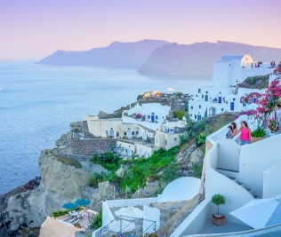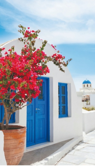 Perissa e Kamari sono i maggiori centri balneari e offrono ogni genere di sistemazione e divertimenti anche serali. Oia, coloratissimo villaggio arroccato sulla Caldera sulla punta nord dell'isola, offre un’aria romantica e chic con tramonti che rimangono negli occhi e nel cuore per una vita intera. Fira, il capoluogo a picco sulla scogliera, è il centro della vita estiva con le sue viuzze pedonali, ristoranti, taverne, negozi e discobar aperti fino a tarda notte. Pyrgos, il paese che sorge nel suore dell'isola e meno battuto dal turismo di massa sta crescendo nel cuore dei turisti che vanno alla scoperta della sua autentica tradizione.