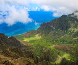 Scogliere e pinnacoli verde smeraldo,cascate, strette valli si susseguono per 17 miglia lungo la famosa costa di Napali,nella parte settentrionale dell'isola, da questa prospsettiva potrete godere di splendide vedute sull'oceano pacifico.